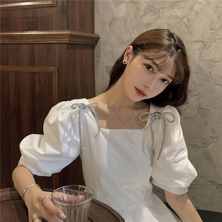 2021新款白色方领连衣裙法式收腰设计感小众泡泡袖裙子短袖高腰