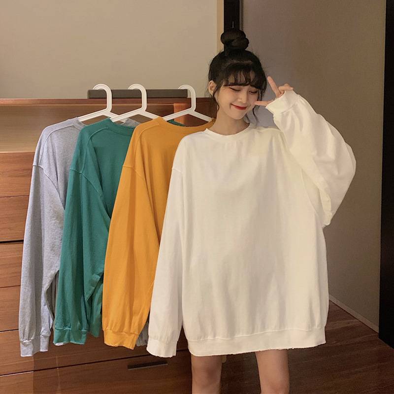 春韩版2021新款宽松中长款下衣失踪破洞基础款长袖卫衣上衣女装