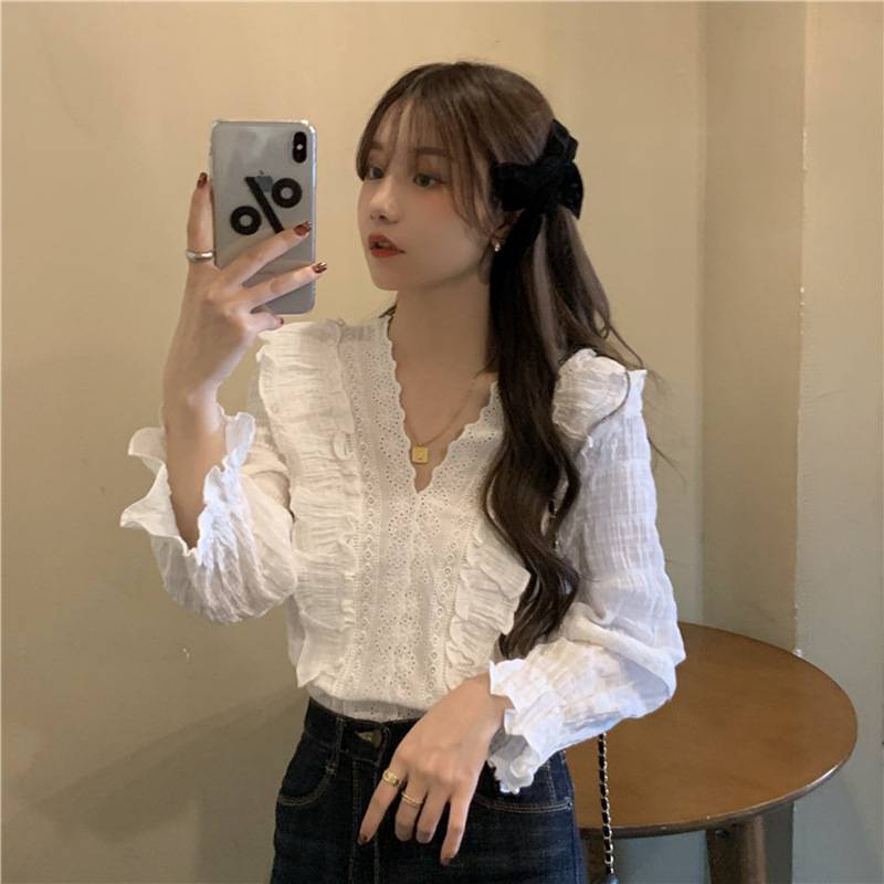 春季韩版2021新款显瘦时尚减龄chic白色V领蕾丝长袖衬衫上衣女装
