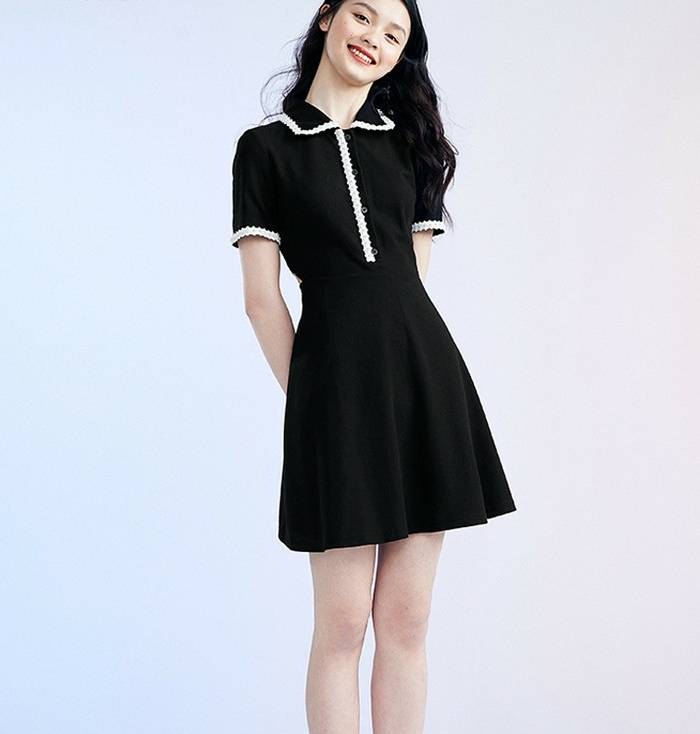 ZAIZAI小黑裙翻领短袖收腰镂空性感连衣裙女2020夏季新款小香风