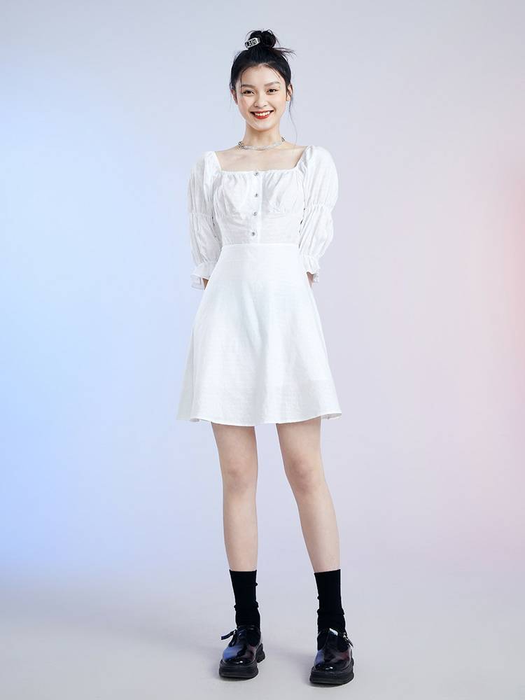 ZAIZAI白色方领连衣裙女2020夏季新款泡泡袖高腰收腰法式复古裙女