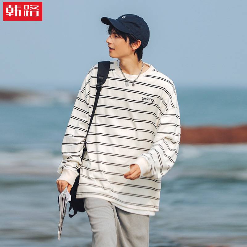 韩路新港风男装 2022秋新款百搭条纹卫衣男休闲情侣宽松刺绣上衣