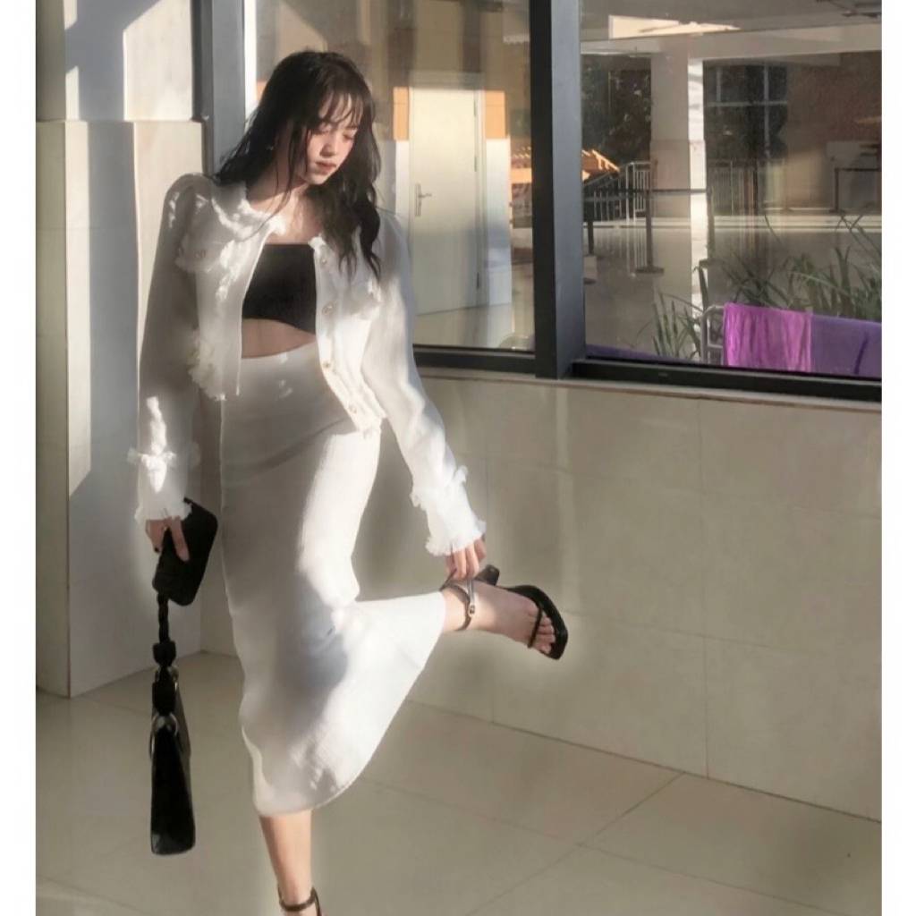 设计感小香风长袖短款外套 后开叉半身裙女秋季2023新款时尚套装