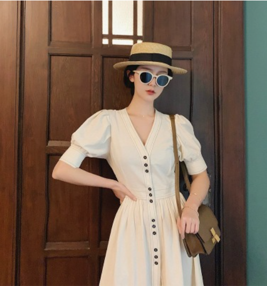 网红220夏季中长款复古高腰灯笼袖气质V领气质收腰法式连衣裙
