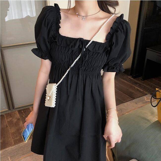 大码女装方领连衣裙女2021新款胖mm泡泡袖小黑裙气质显瘦中长裙子