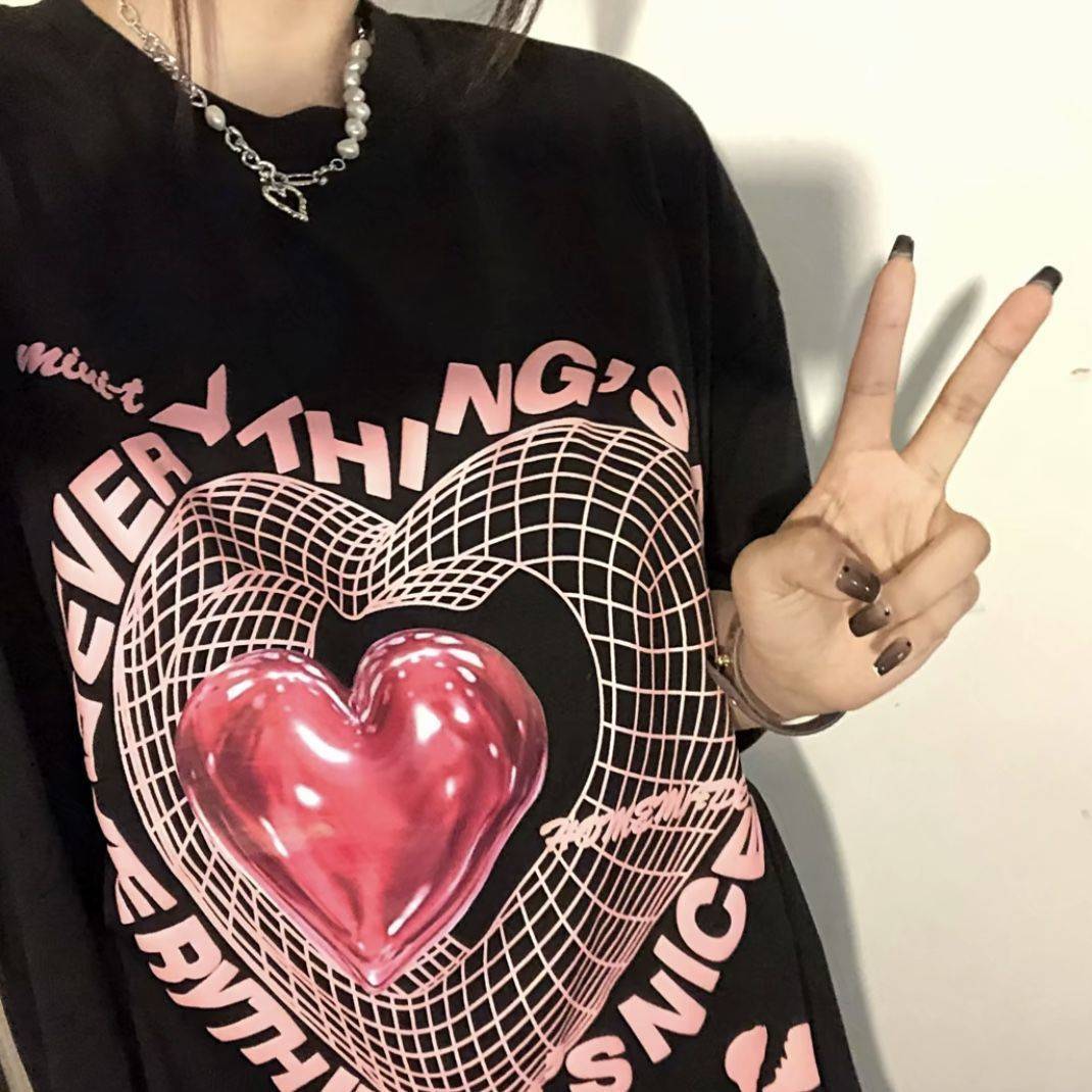 夏季2021新款100%纯棉短袖t恤女学生韩版宽松上衣爱心半袖衣服女