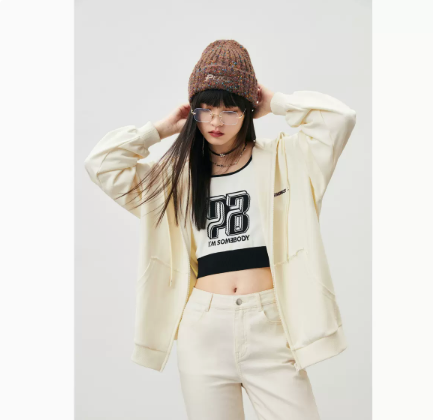 太平鸟连帽卫衣外套女2022早秋新款宽松标语字母白色卫衣开衫外套