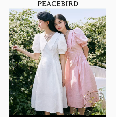 太平鸟粉色赫本风连衣裙白桃气泡水2022夏季新款收腰温柔气质长裙
