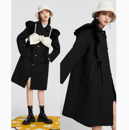太平鸟女装丝绒飞飞袖毛呢外套女中长款2022新款秋装尼子呢子大衣