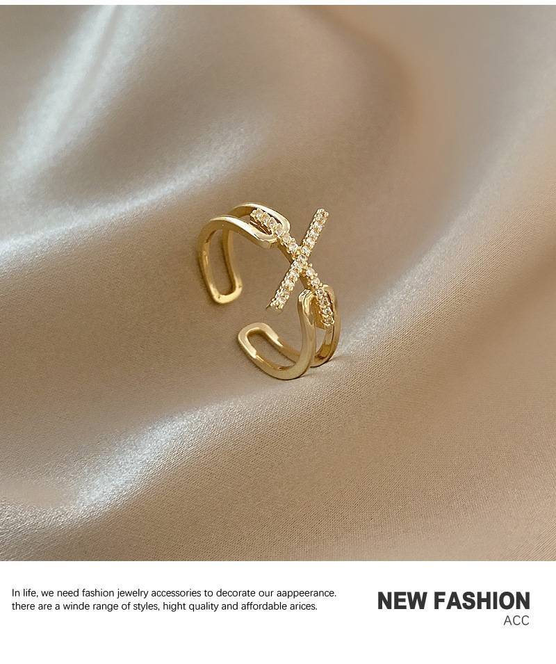 韩版气质微镶锆石戒指女简约几何形交叉食指戒可调节开口个性手饰
