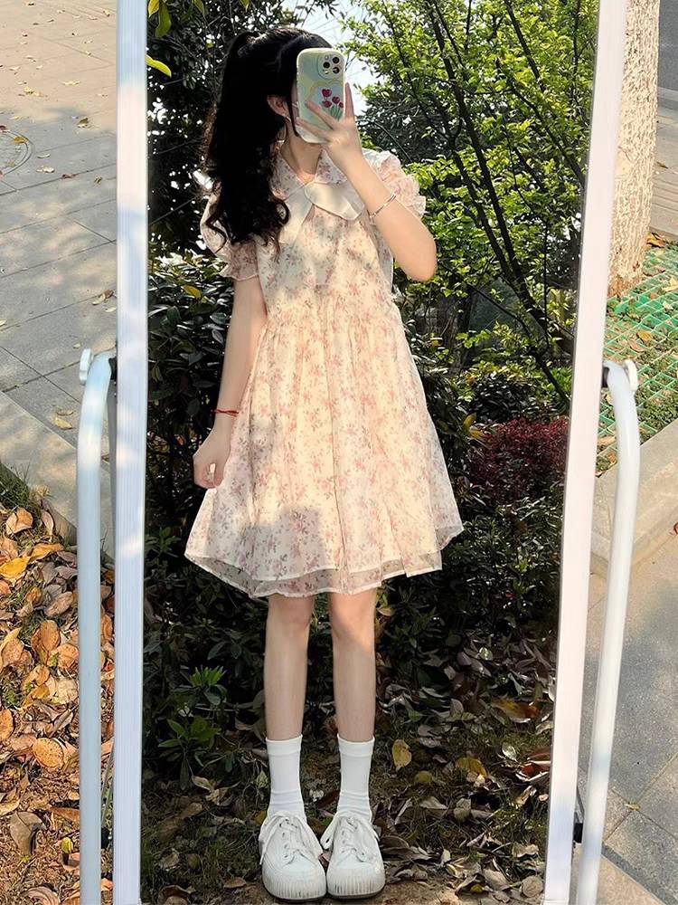 茶歇法式气质碎花连衣裙子2023夏季新款女装小个子泡泡袖显瘦短裙