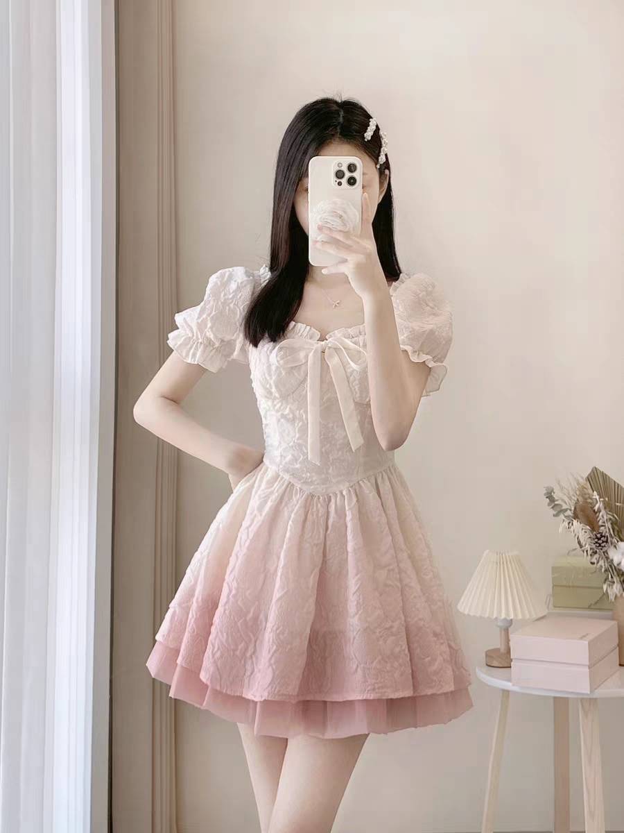 法式泡泡袖方领连衣裙女夏季裙子初恋系可爱甜美收腰a字蓬蓬短裙