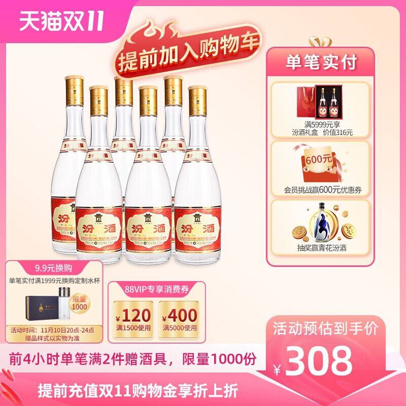 山西汾酒杏花村酒 玻汾酒53度 黄盖汾酒 475mL*6瓶