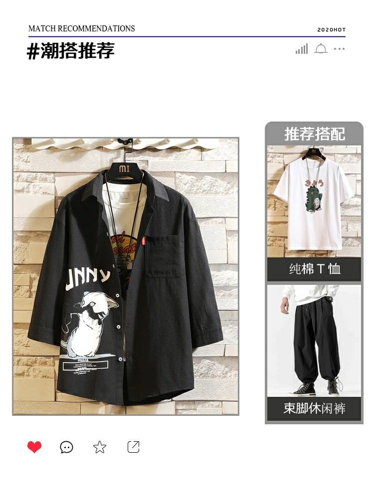 夏季七分袖衬衫男宽松韩版潮流帅气大码短袖衬衣新款印花休闲外套