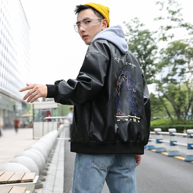 胖子机车皮衣男春秋季加肥加大码宽松潮流休闲PU皮夹克男刺绣外套