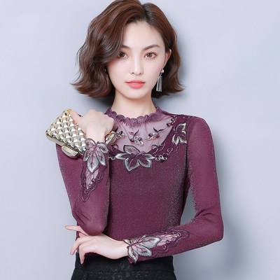 修身t恤女长袖网纱上衣女2019新款韩版秋装大码洋气半高领打底衫Z