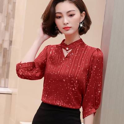 中袖半袖遮肚子雪纺衫女9新款春夏大码女装七分袖宽松洋气衣