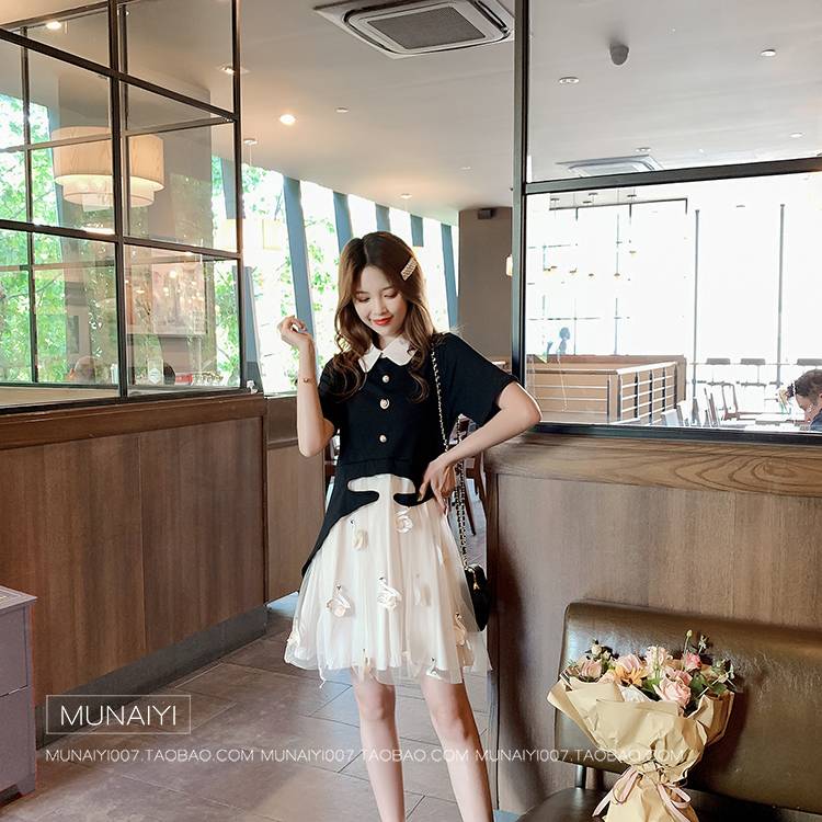 夏季新款女装韩版设计感仙鹤网纱假两件拼接连衣裙