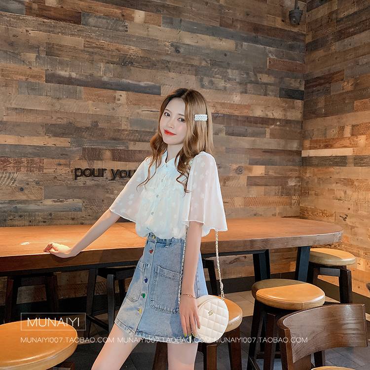 白衬衫女韩版设计感小众荷叶边短袖2019新款夏木耳娃娃领宽松衬衣
