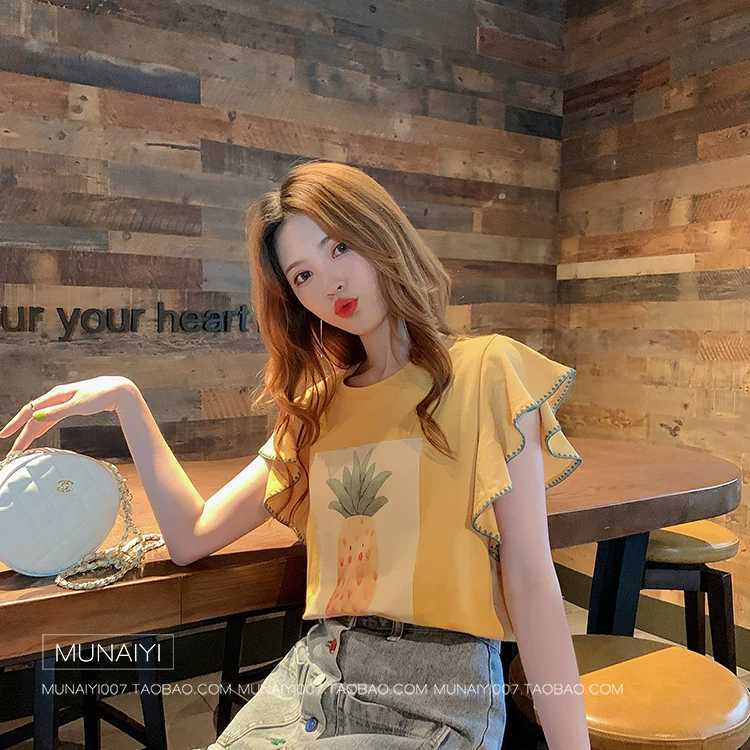 荷叶边菠萝黄色短t恤女宽松2019新款夏韩版甜美飞飞袖半袖