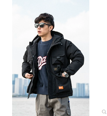 ins工装棉衣男宽松日系潮牌加厚保暖棉袄黑色连帽羽绒棉服外套冬