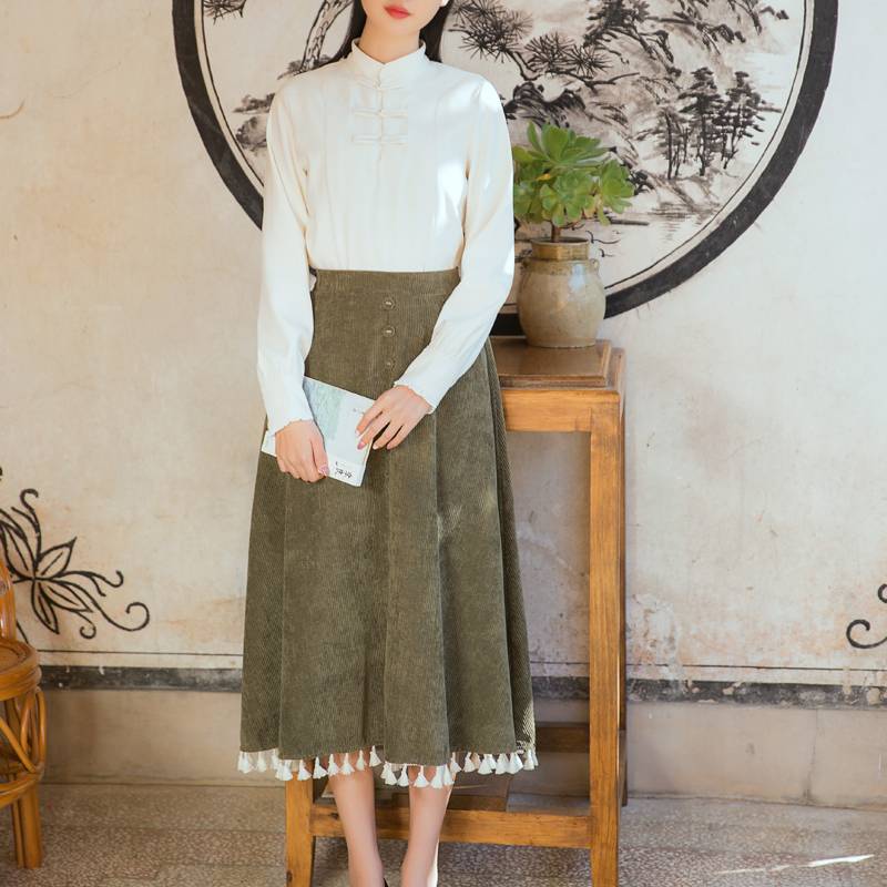 复古文艺学生灯芯绒流苏高腰半身裙A字裙伞裙中长款女春