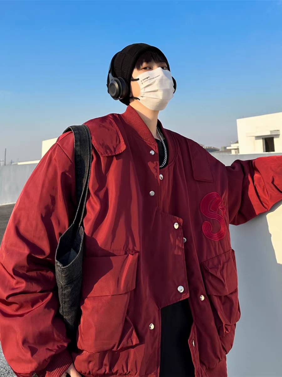 2023年酒红色不规则工装外套男春秋季高级感飞行员夹克短款棒球服