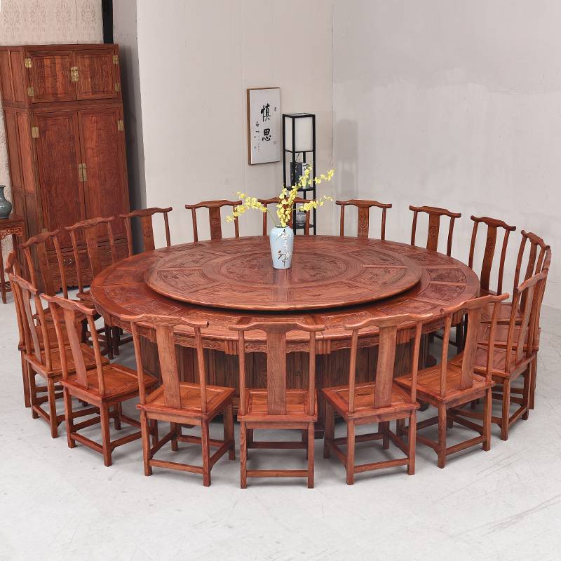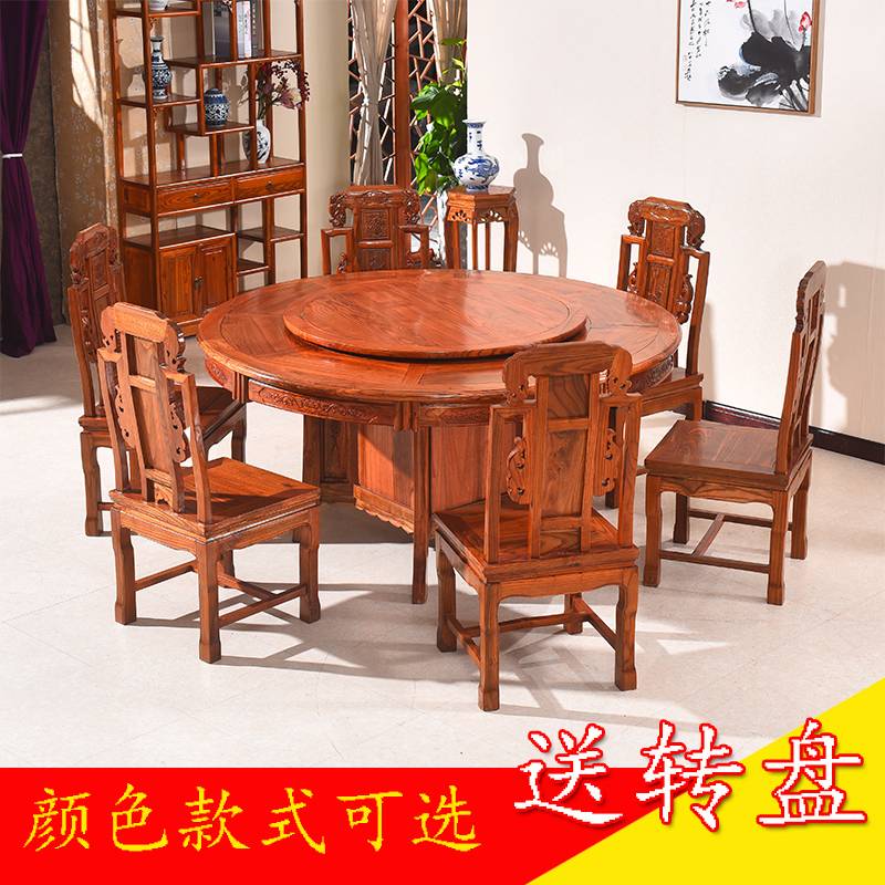 2018新款实木圆桌餐桌椅组合家用中式仿古雕花带转盘酒店饭馆专用