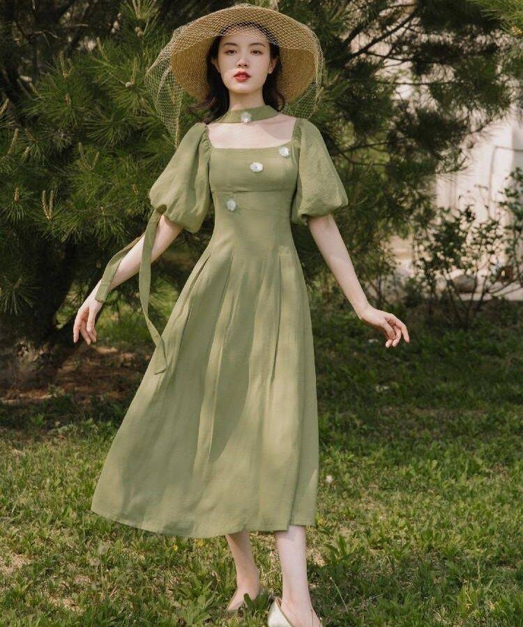 法式别致设计感小众复古可甜可盐牛油果绿色连衣裙仙女裙温柔风