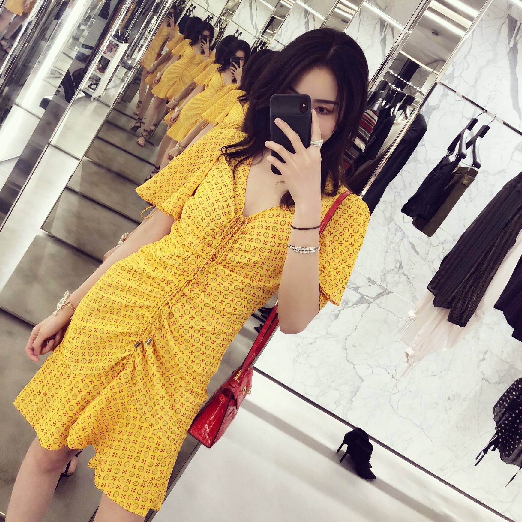 店主同款 时髦名媛亮黄色高品质褶皱修身显瘦V领连衣裙