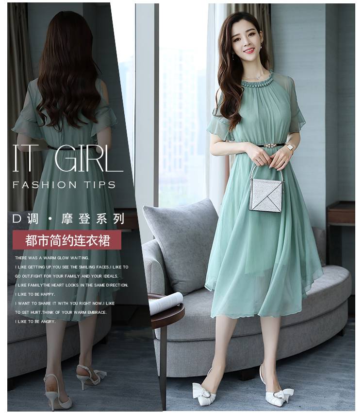 露肩休闲时尚中长款收腰高腰连衣裙纯色中