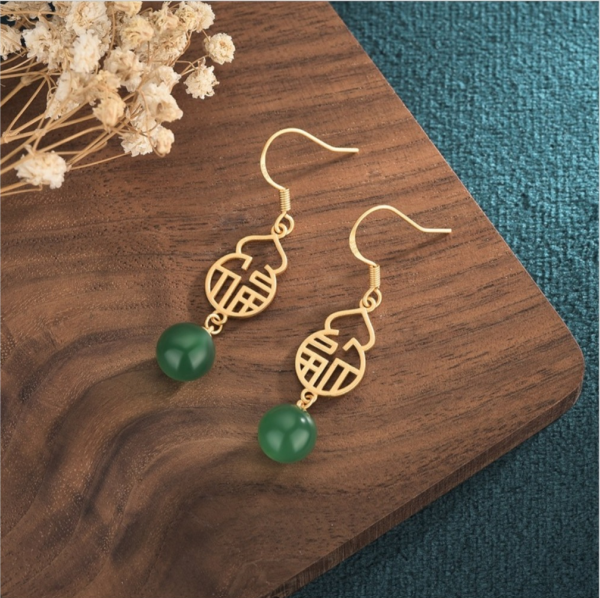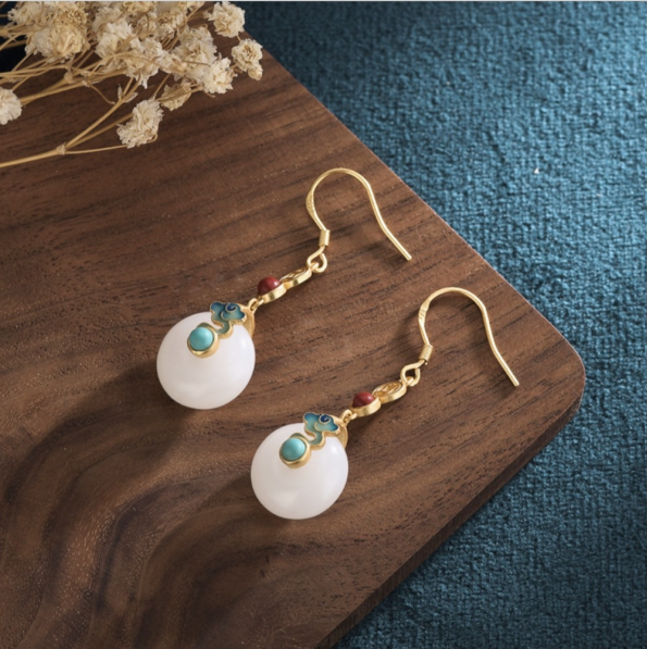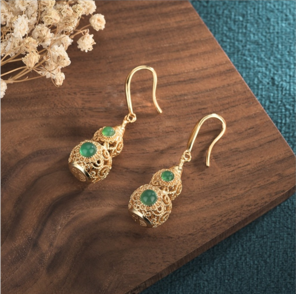 古法金创意国潮古风福禄耳钉银镀金镶天然玉髓碧玉葫芦耳环耳饰