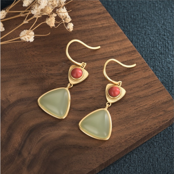 宫廷风设计古法金镶嵌仿和田玉青玉长款耳环汉服旗袍耳饰品银饰