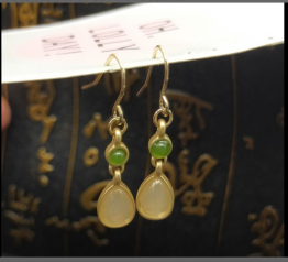 古装汉服民族风耳饰黄铜鎏金镶碧玉镂空耳饰和田碧玉葫芦耳环