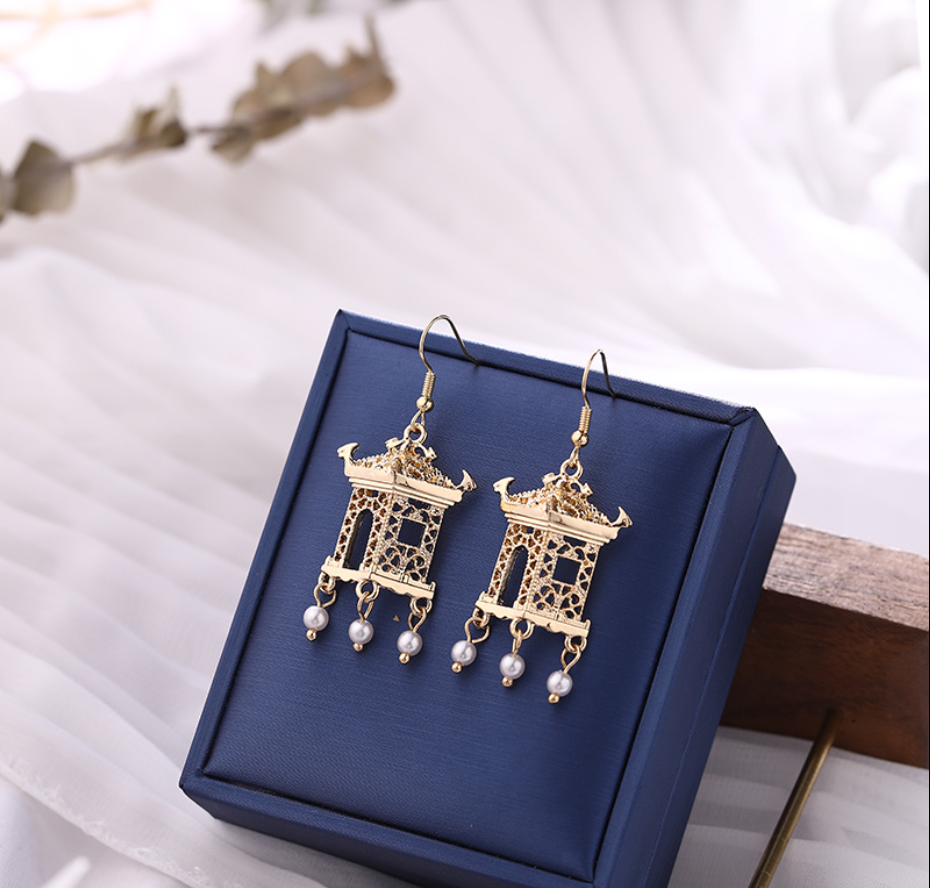 气质简约珍珠耳坠复古风亭台耳钉女个性优雅造型耳环A15