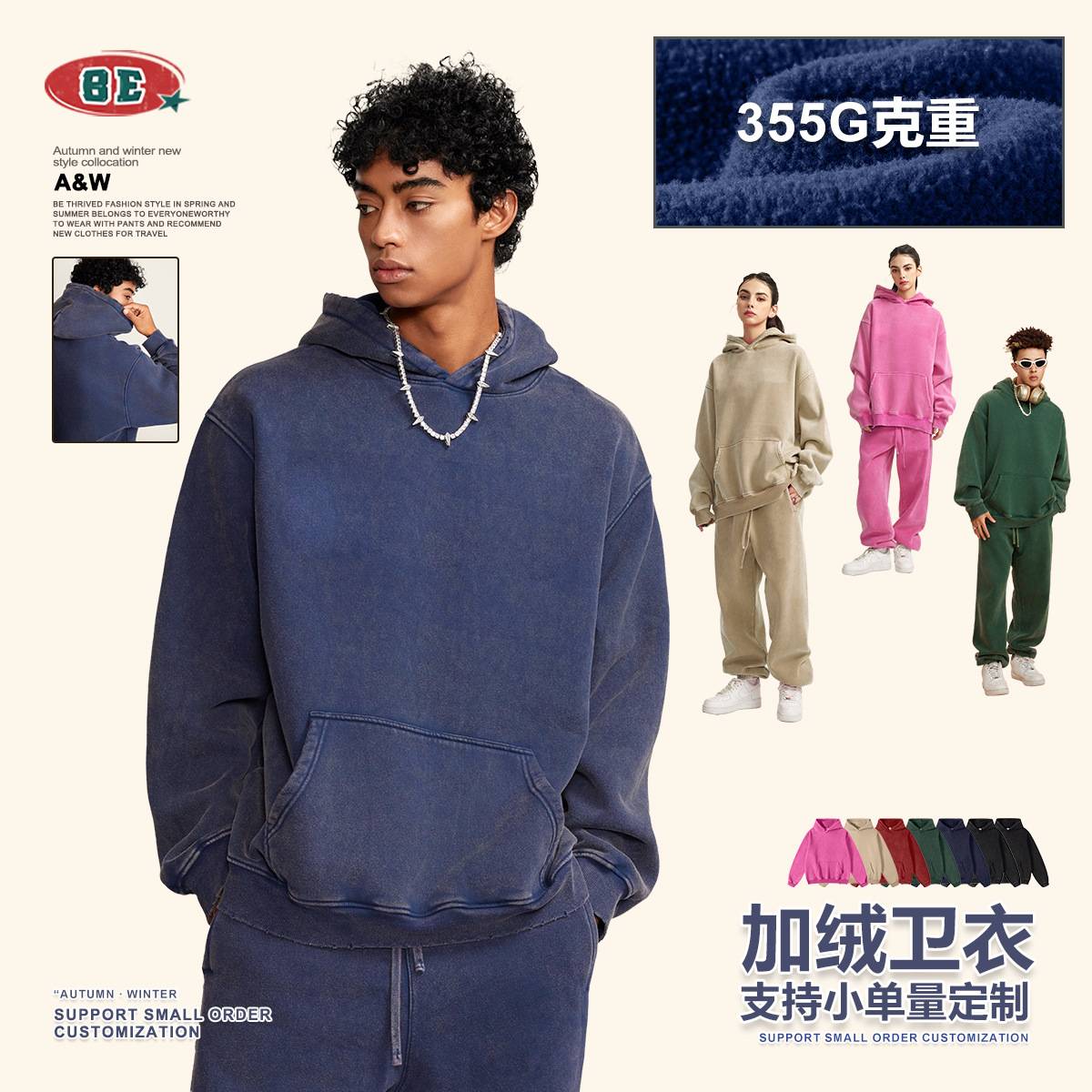 BE男装2025秋冬外贸潮牌痞帅重磅水洗复古卫衣男加绒连帽男式卫衣