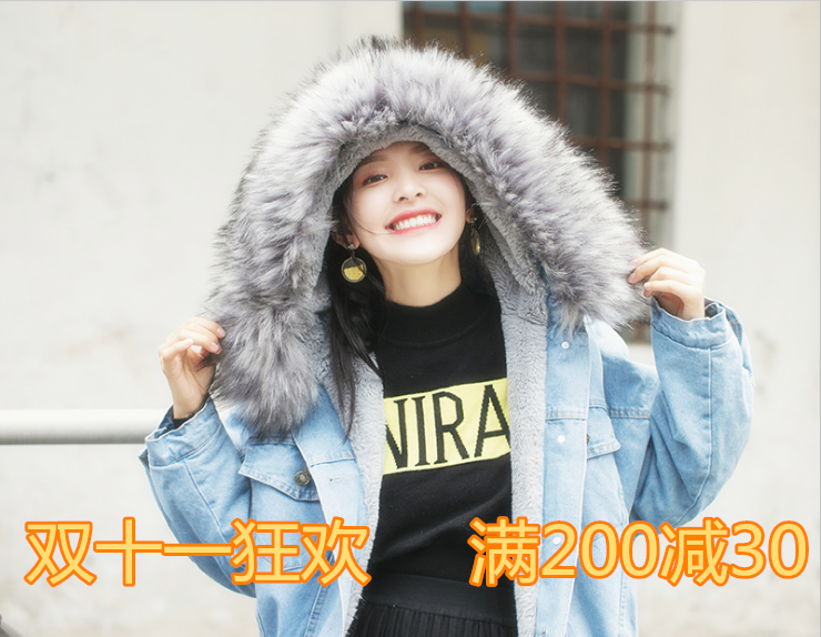 2018冬季新款韩版chic羊羔毛加厚宽松大毛领牛仔棉衣外套女优惠促销 158.00 已售:0件