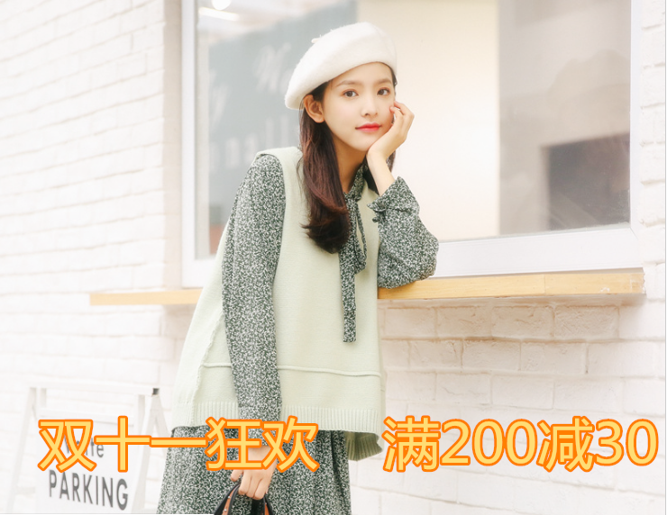 2018秋冬韩版小清新碎花裙荷叶边系带雪纺群舞针织背心2件套 168.00 已售:0件