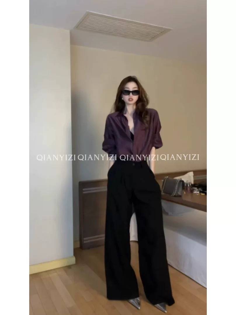 法式气质紫色醋酸缎面防晒长袖衬衫女夏薄款宽松外搭衬衣外套上衣