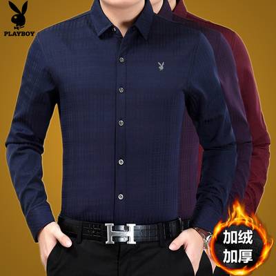 花花公子加绒厚中年男衬衫长袖宽松保暖冬装