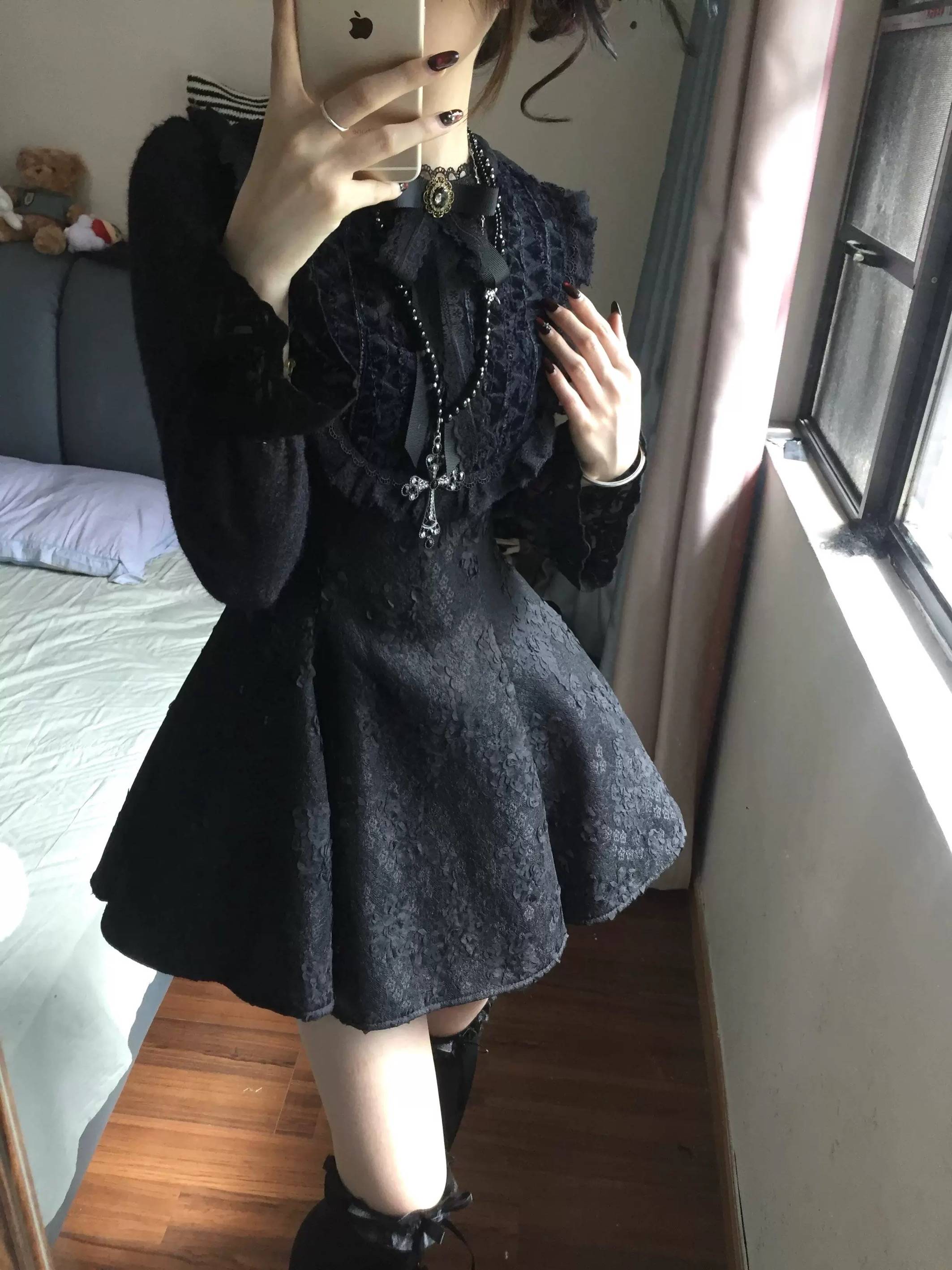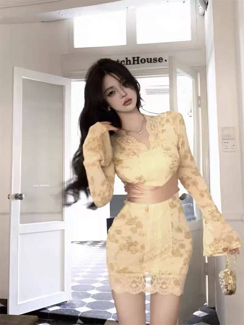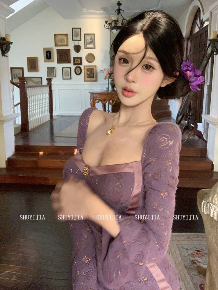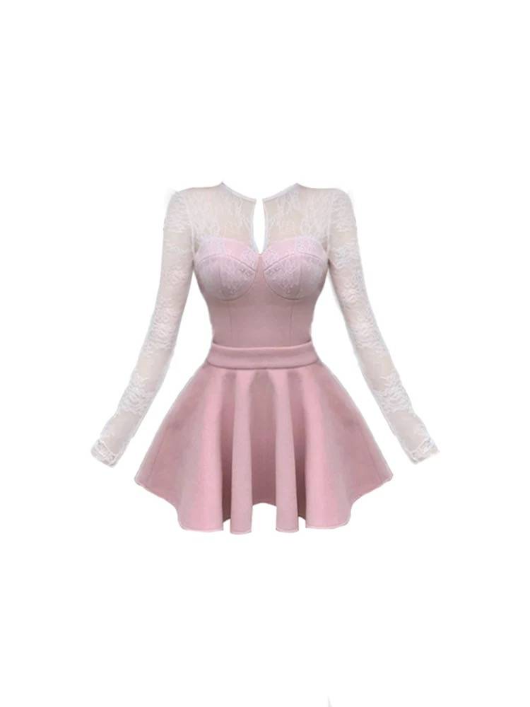 LINSIQIN纯欲蕾丝拼接镂空连衣裙女秋冬2024高级感气质名媛晚礼裙