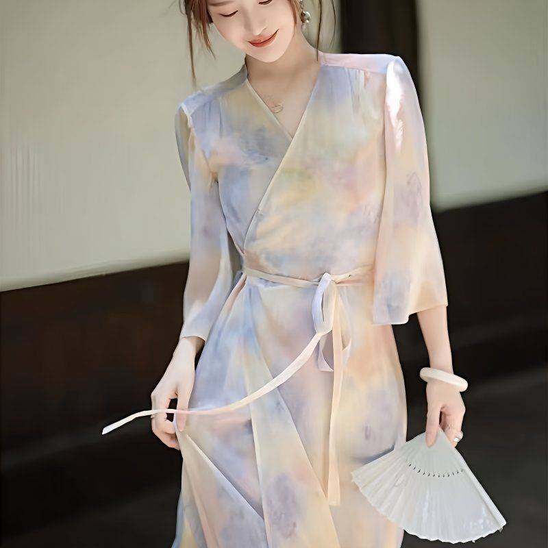 法式连衣裙夏2021新款女 樱桃印花裹身裙V领系带束腰雪纺长裙