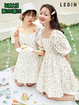 乐町气质复古连衣裙2021新款春女装奶油蜜桃蝴蝶结连衣裙