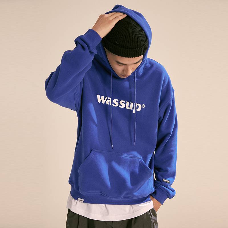 国潮牌春季宝蓝纯色棉外套印花logo加绒连帽宽松套头卫衣