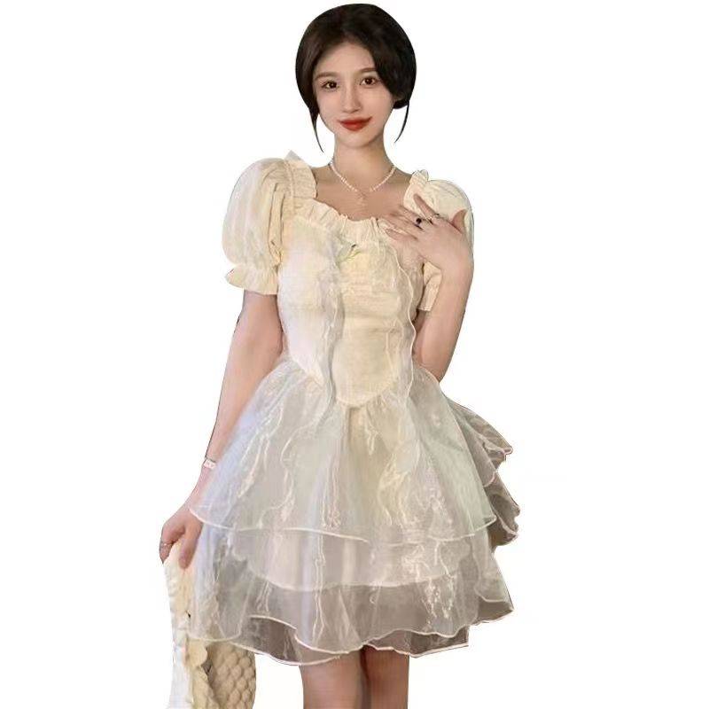法式甜美网纱裙子2020夏季新款时尚V领刺绣百搭气质碎花连衣裙女