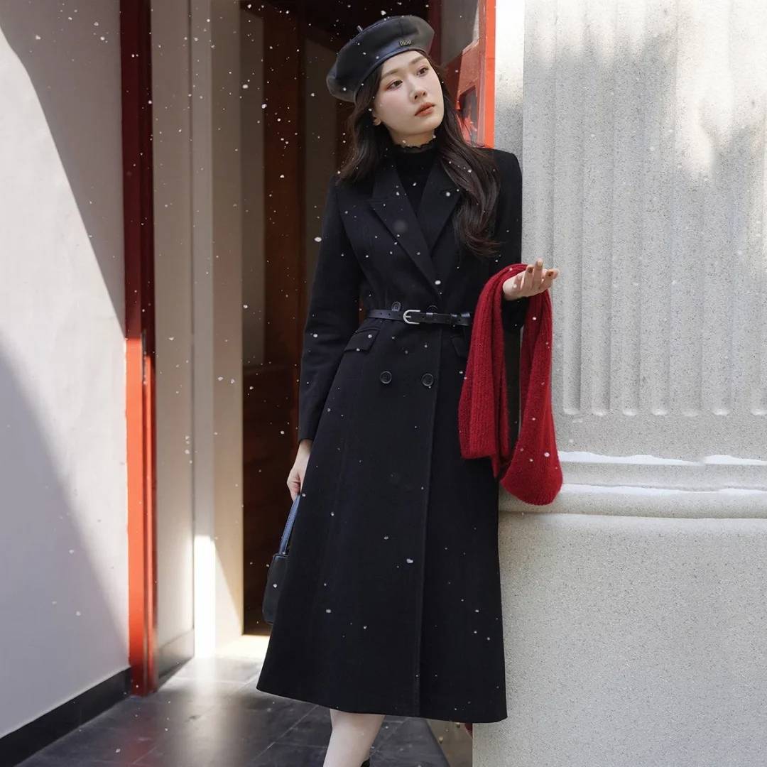 黑色长款毛呢大衣