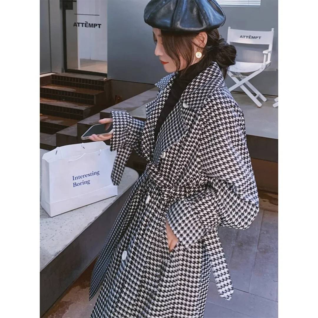 黑白格毛呢大衣
