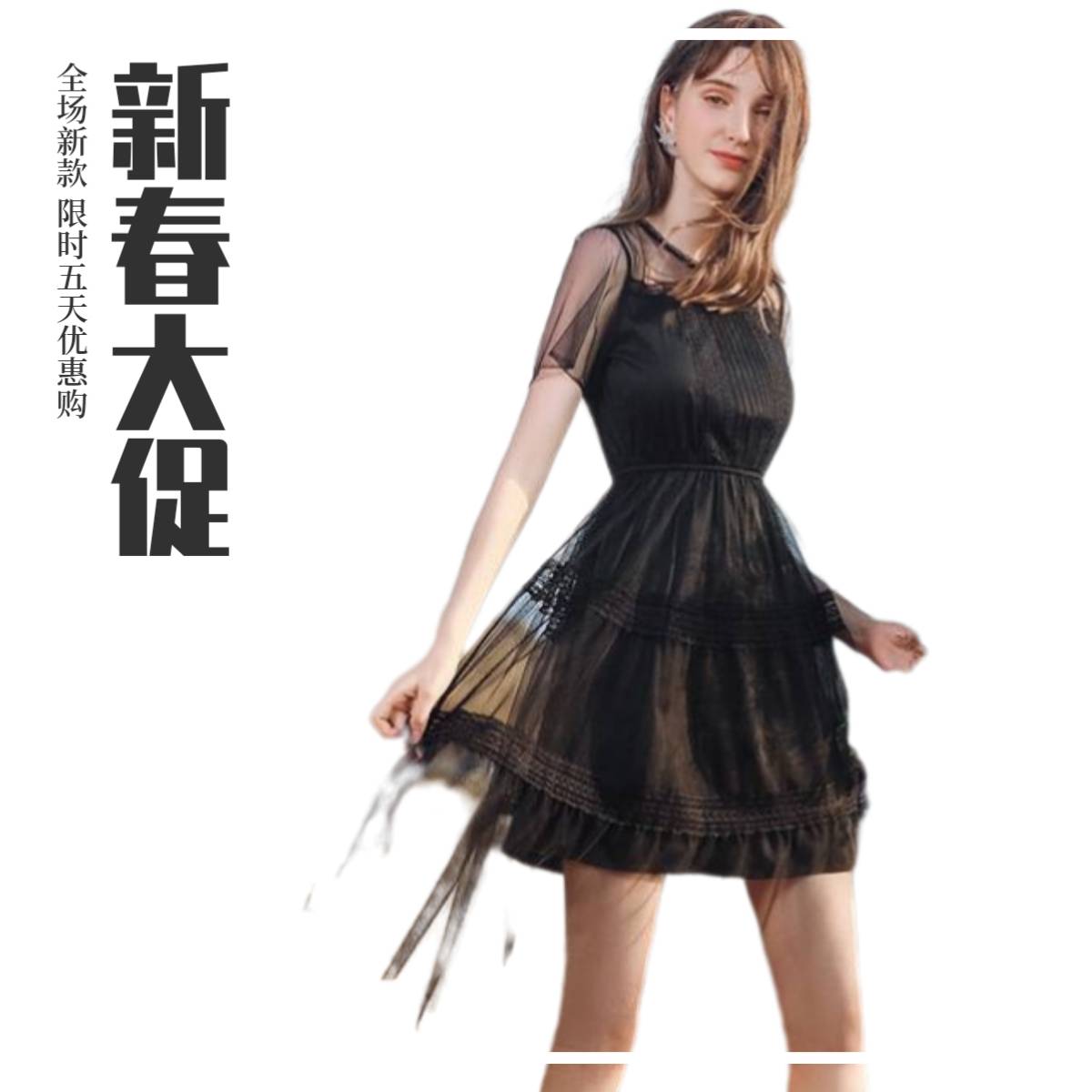 显瘦连衣裙 2022夏季新款品牌女装圆领一粒扣网纱a字裙