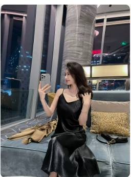 醋酸缎面吊带连衣裙2024夏季新款法式性感宽松V领过膝宽松A字裙子