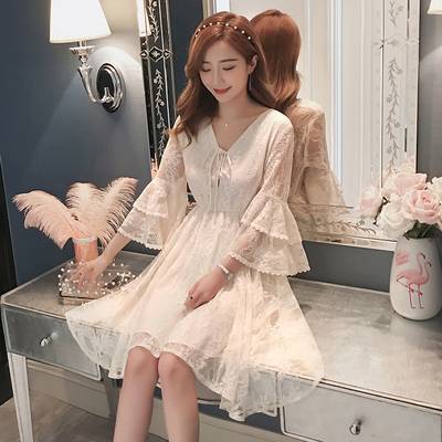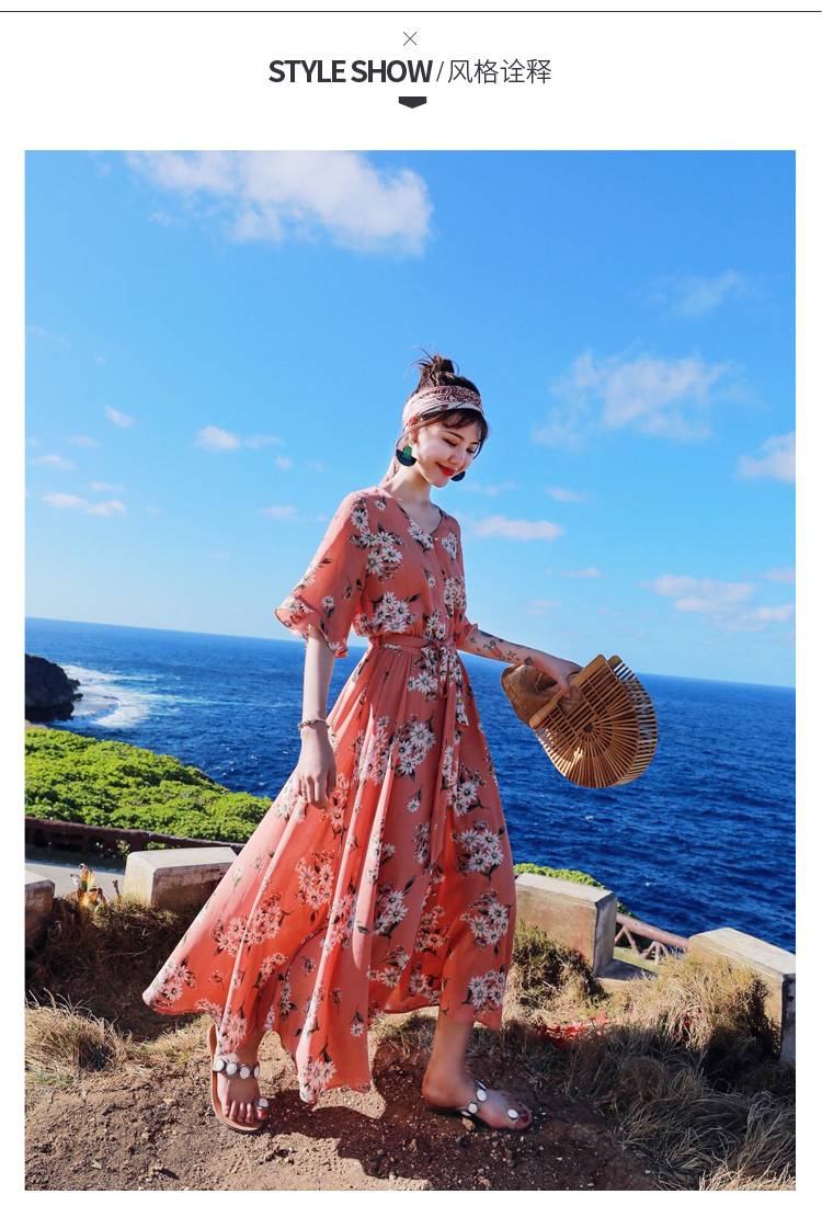 2019夏季新款海边度假沙滩裙性感露背连衣裙女V领中袖蕾丝大摆裙